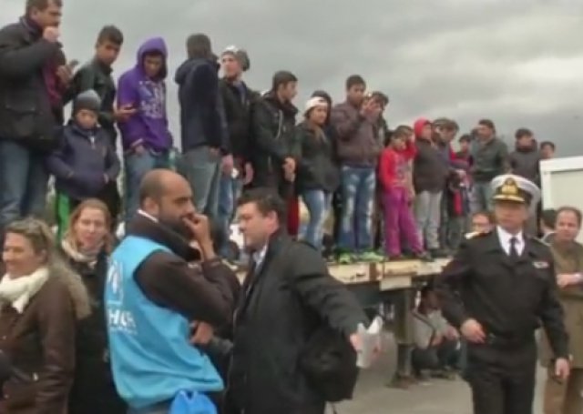 Prvý, na ktorý migranti narazia po vystúpení z trajektu, leží v prístave Pireus. Počas posledných dní tú vyrástlo stanové mestečko. Migranti po vystúpení z trajektov sedia na betóne u svojich batožín, niektorí na rampe u opustenéj haly začínajú rozbaľovať stany. Od mora ostro fúka.